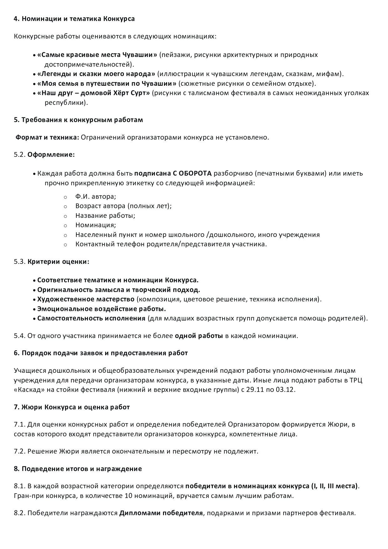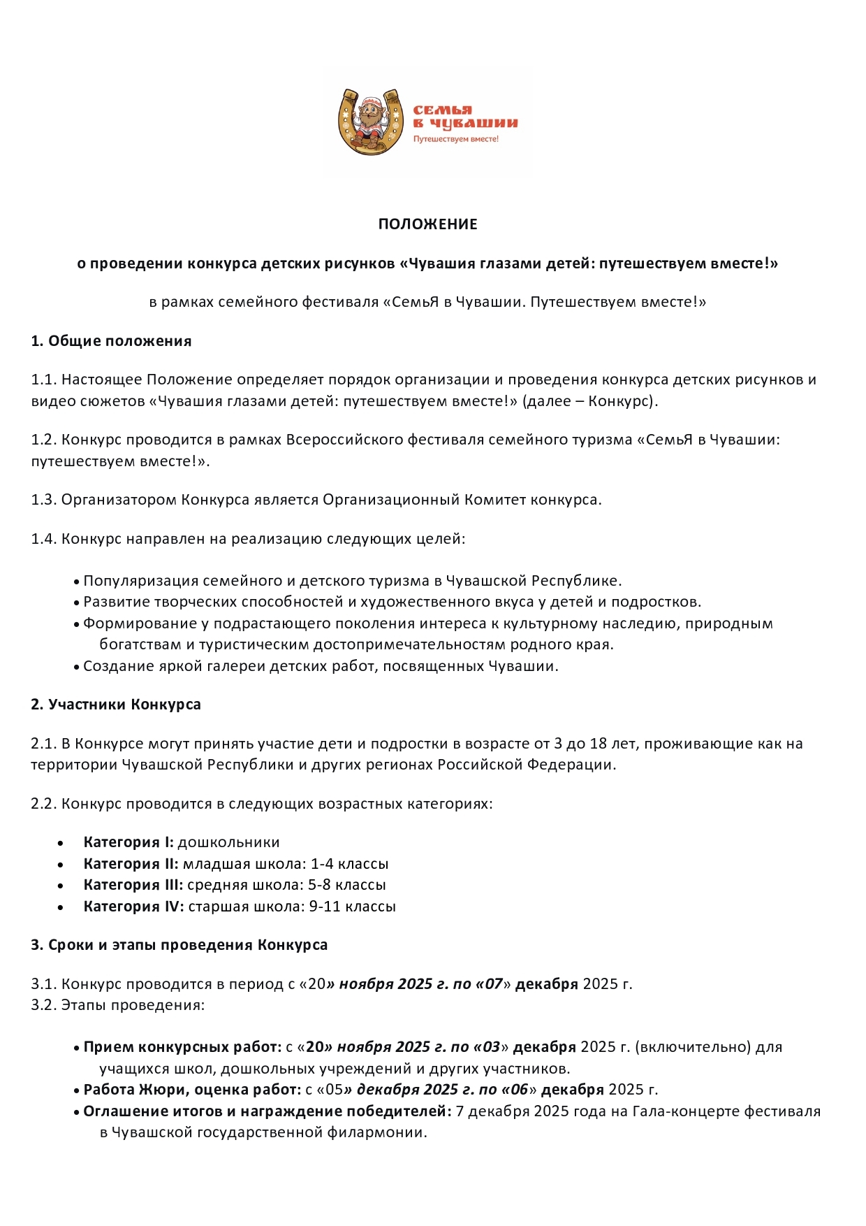 Оргкомитет Всероссийского фестиваля семейного туризма «СемьЯ в Чувашии: путешествуем вместе!» объявляет о старте творческого конкурса детских рисунков «Чувашия глазами детей: путешествуем вместе!». К участию приглашаются дети и подростки в возрасте от 3 до 18 лет. Конкурс призван раскрыть творческий потенциал подрастающего поколения и показать уникальность Чувашской Республики через детское восприятие.