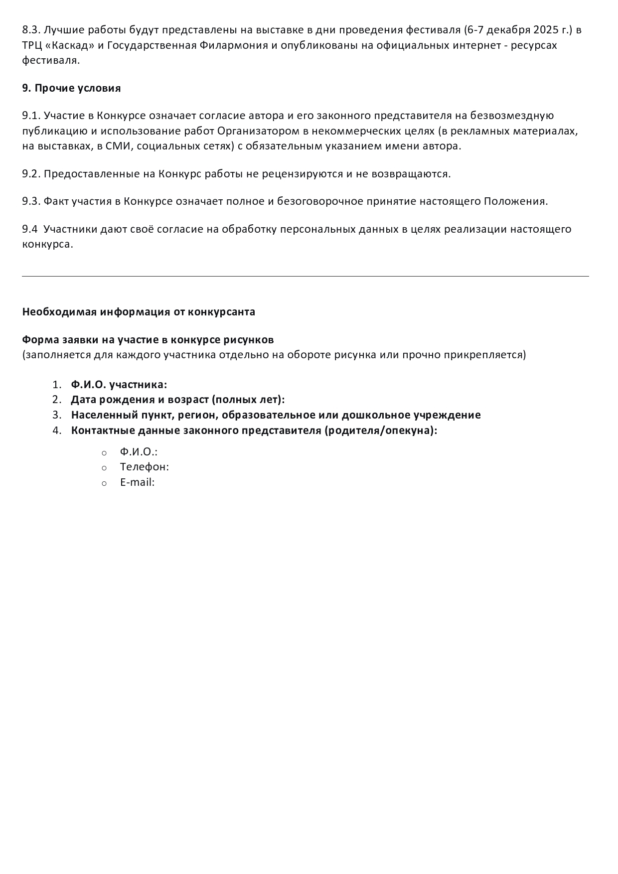 - Лучшие рисунки будут представлены на выставках в ТРЦ «Каскад» и Государственной филармонии 6-7 декабря, а также опубликованы на официальных ресурсах фестиваля.